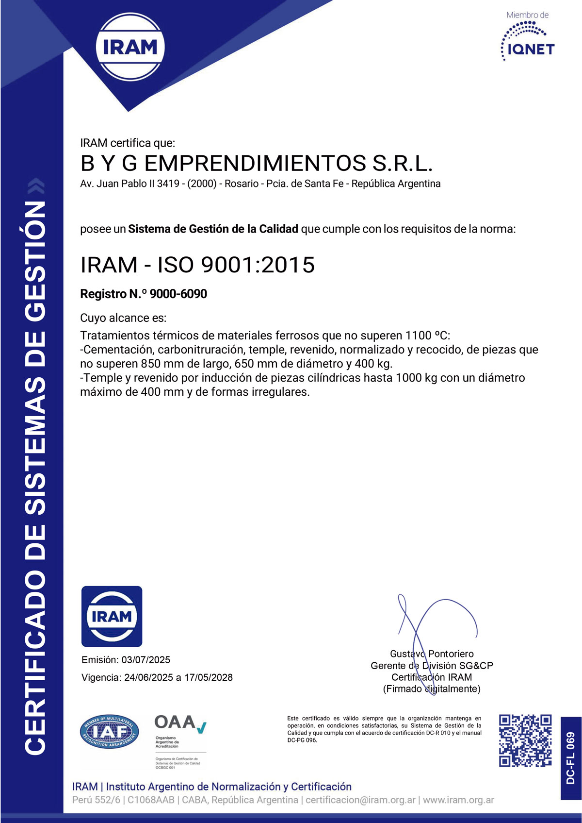 Contamos con Certificación ISO9001/15 en Tratamientos térmicos de: temple por inducción y revenido de piezas de hasta 1000kg, cilíndricas hasta un diámetro máximo de 400mm y de formas irregulares.